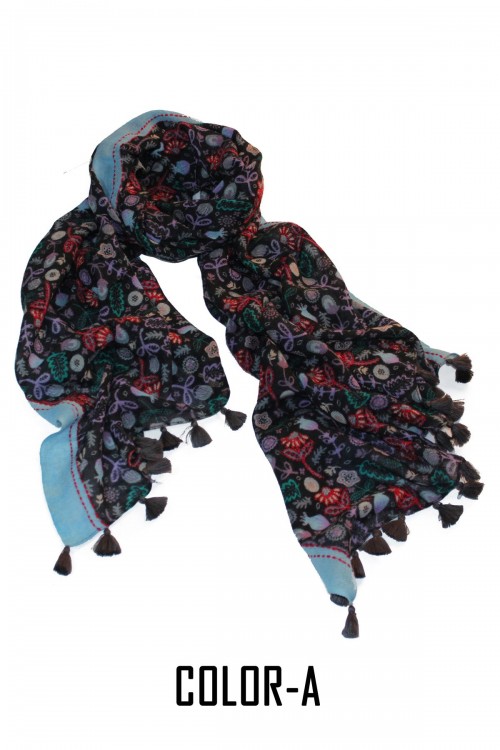 COMPOSITION – 100% Woolen Screen Printed Embroidery Highlighted Scarf With Pompom.