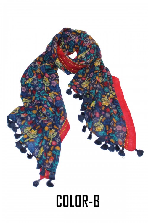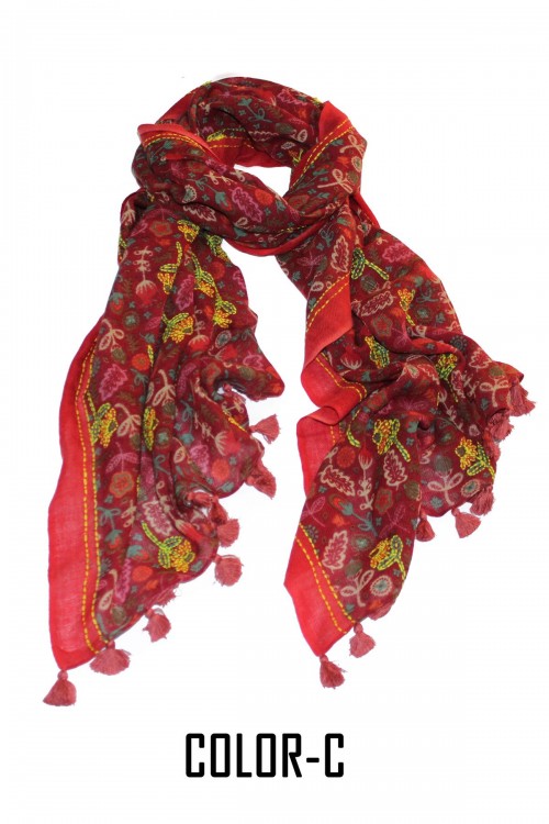 100% Woolen Screen Printed Embroidery Highlighted Scarf With Pompom.
